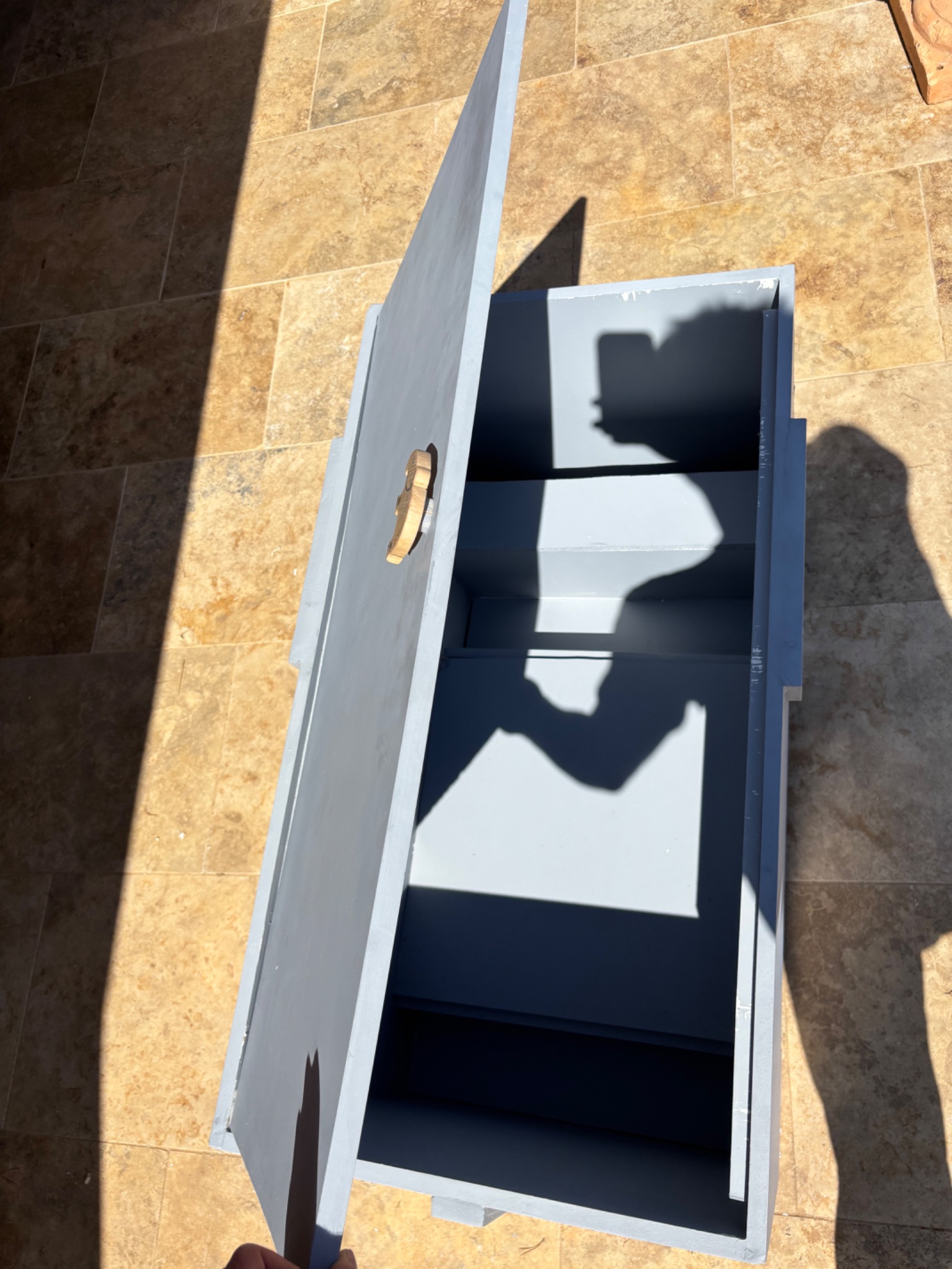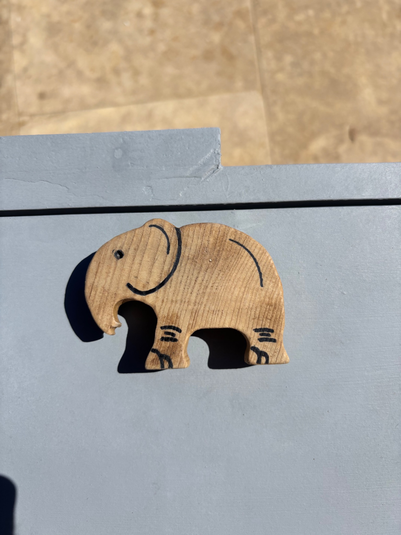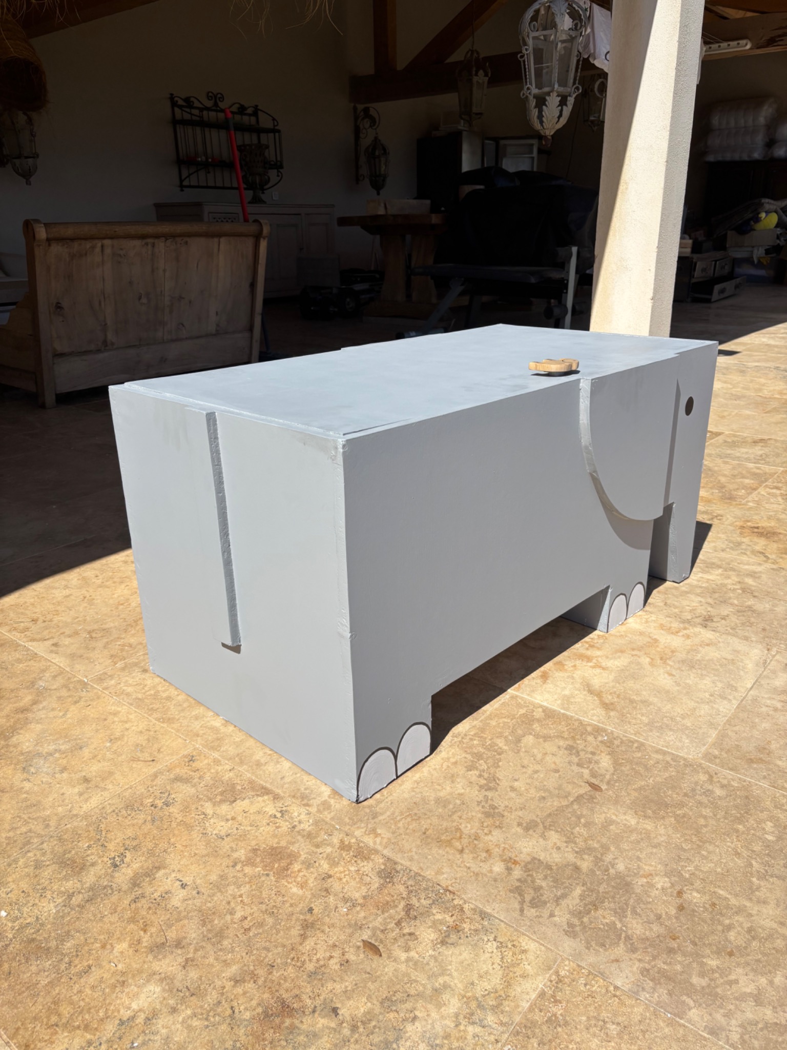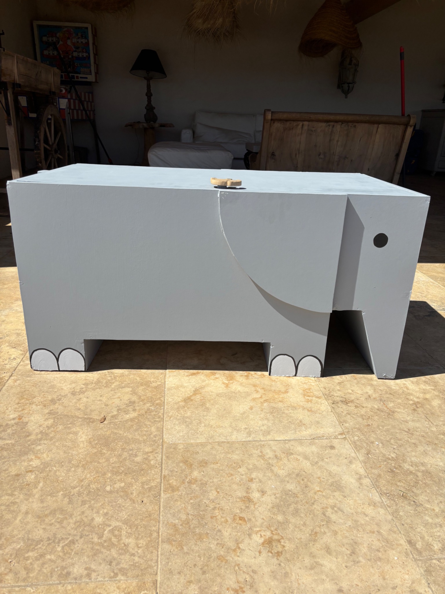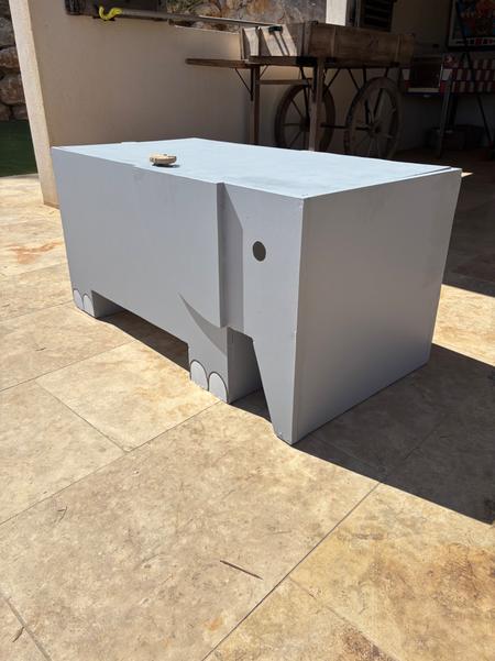 La table éléphant peut s'ouvrir afin de pouvoir ranger les jouets à l'intérieur. Je ne trouvais pas de poignets adapté, j'ai donc sculpté dans une planche de bois une poignet en forme d'éléphant.