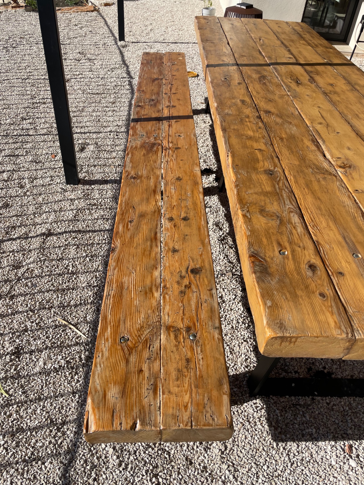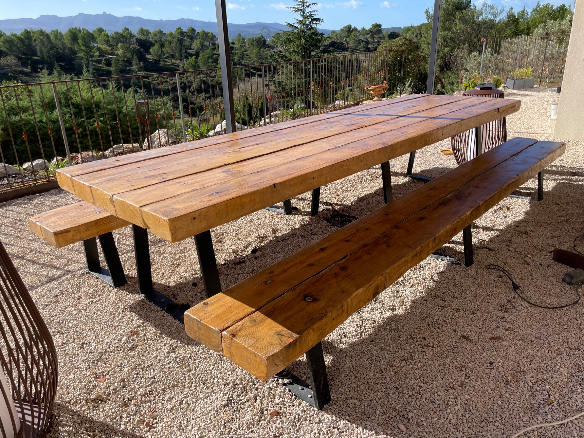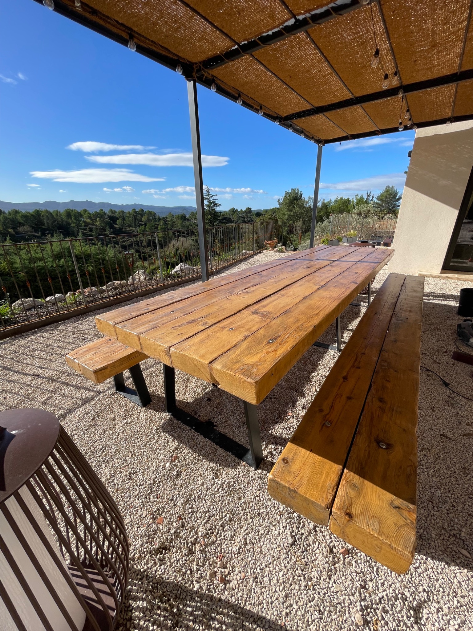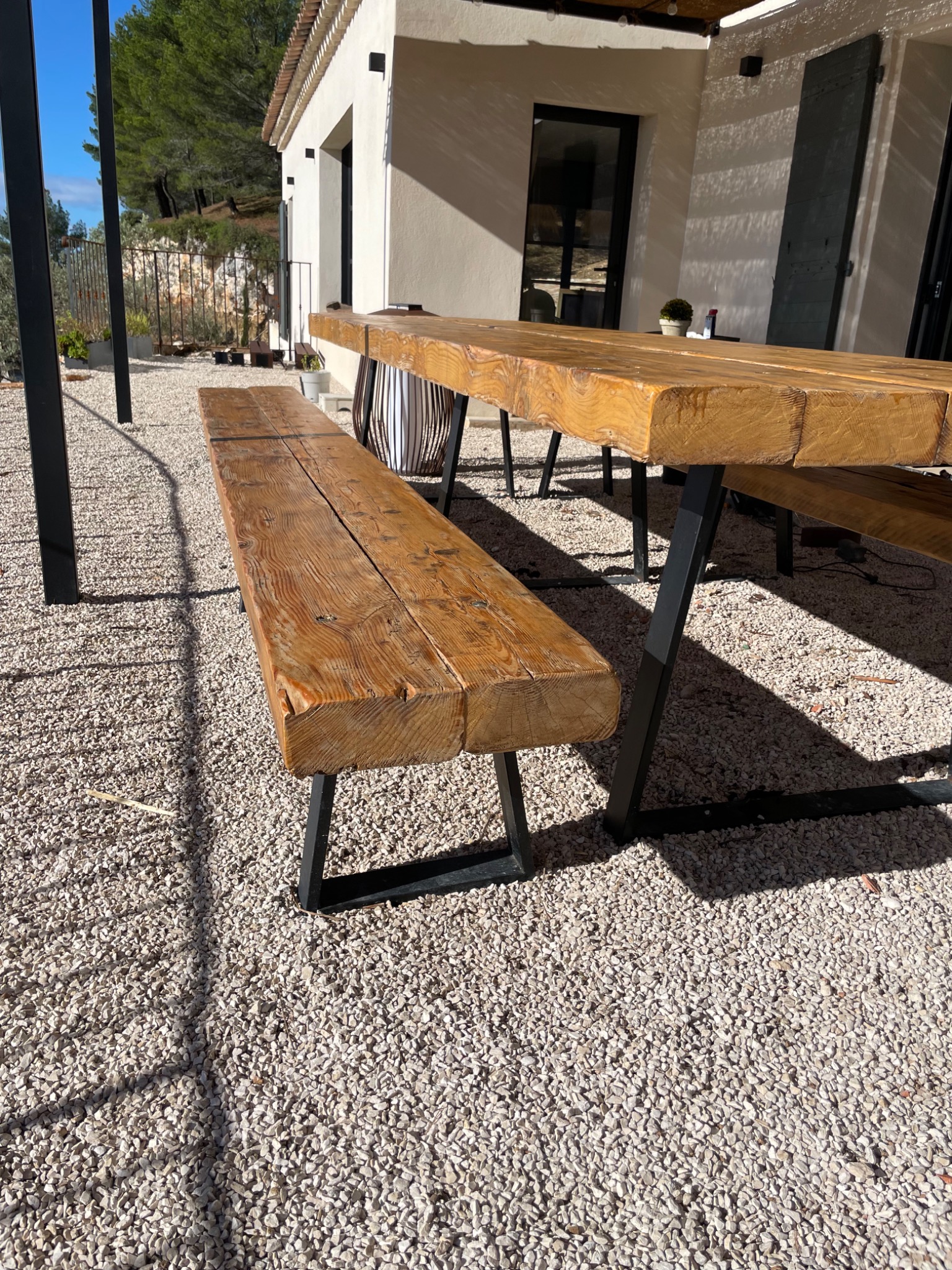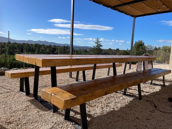 Création d'une table et 2 bancs de 3m de long et 2m de large à partir de bastaing utilisé comme charpente.