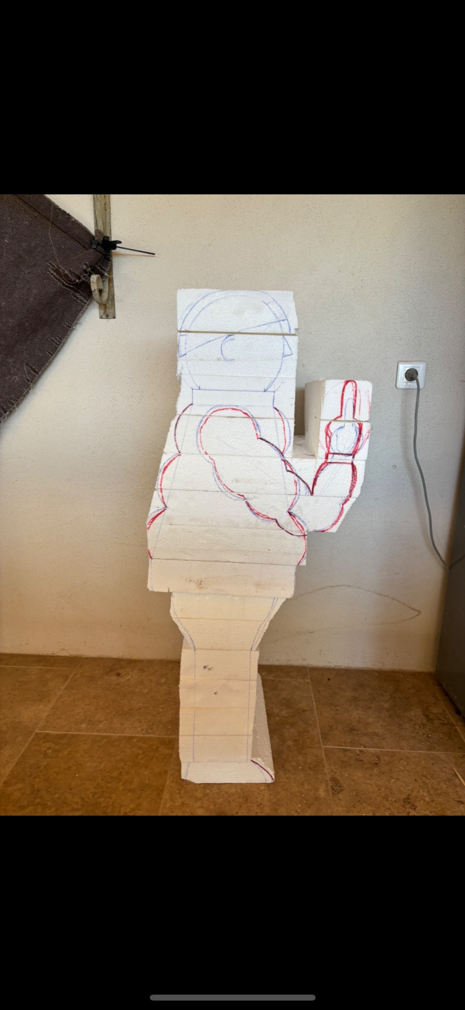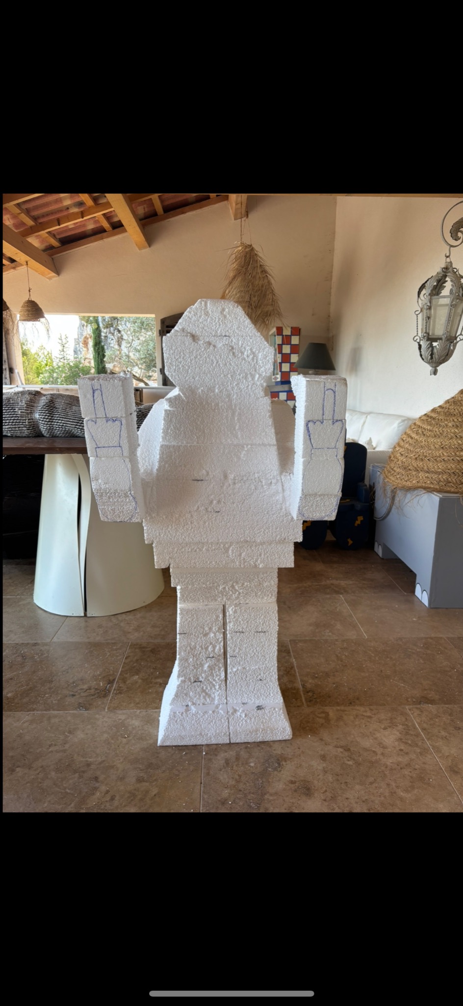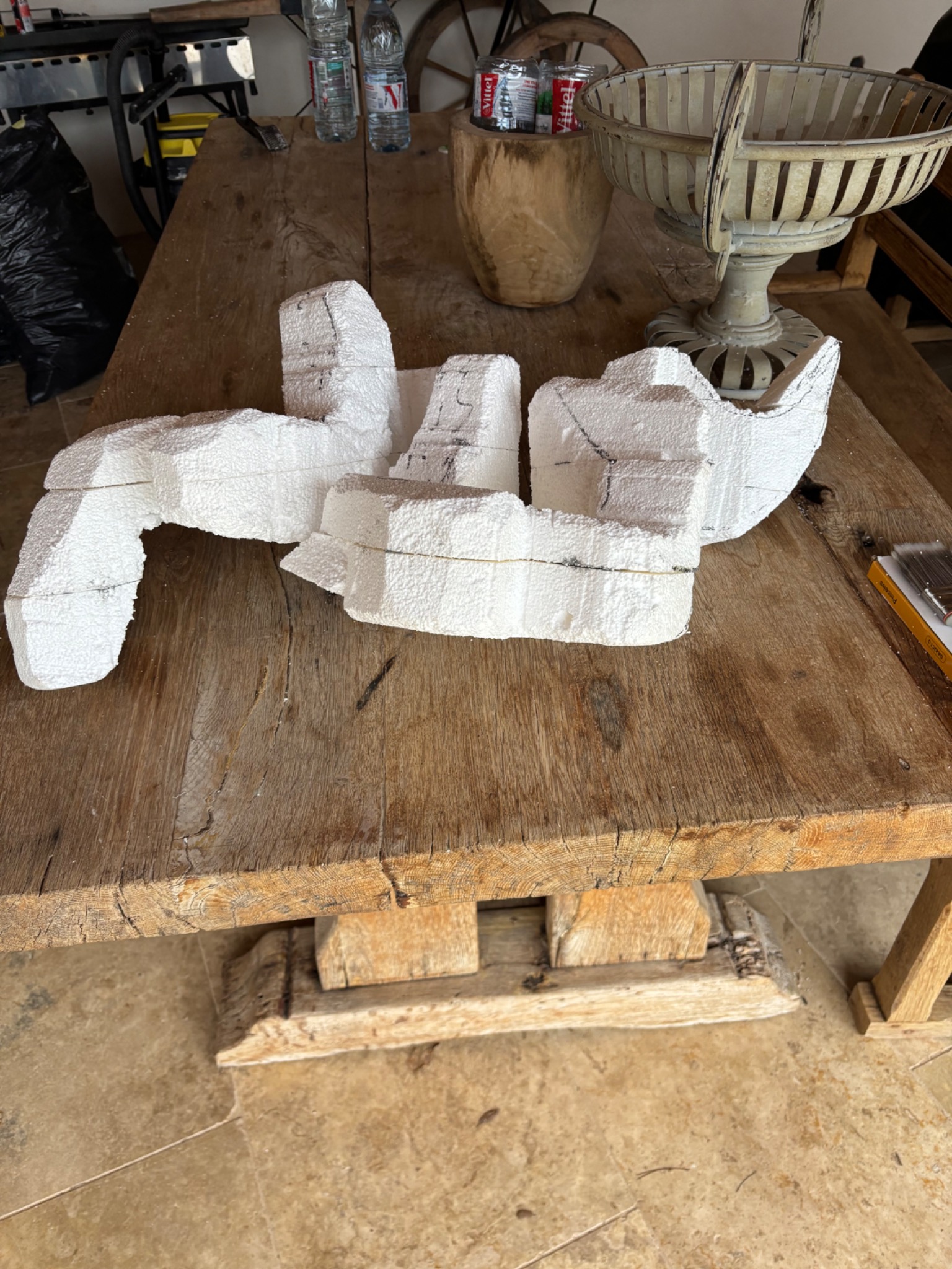 Pour réaliser mes sculptures, je pars de plusieurs plaques de polystyrène extrudé (celui qui nous sert d'isolant, meilleur car plus compact que le polystyrène expansé), que je colle entre-elles. J'ai alors un gros bloc de polystyrène, je peux ensuite dessiner la forme de ma sculpture sur les faces et passer à la découpe, puis à la mise en forme plus précise.
