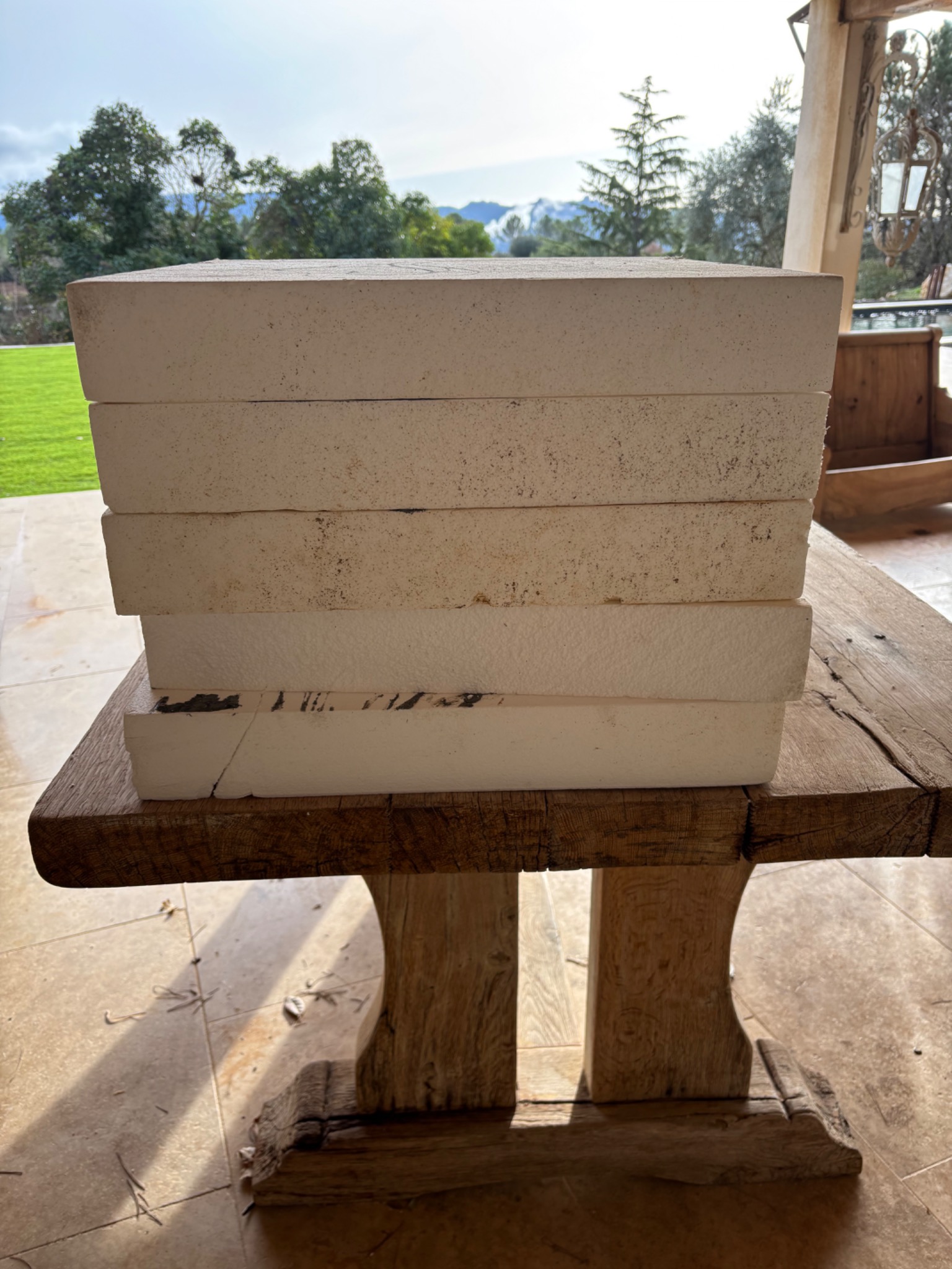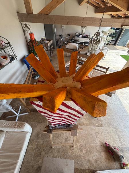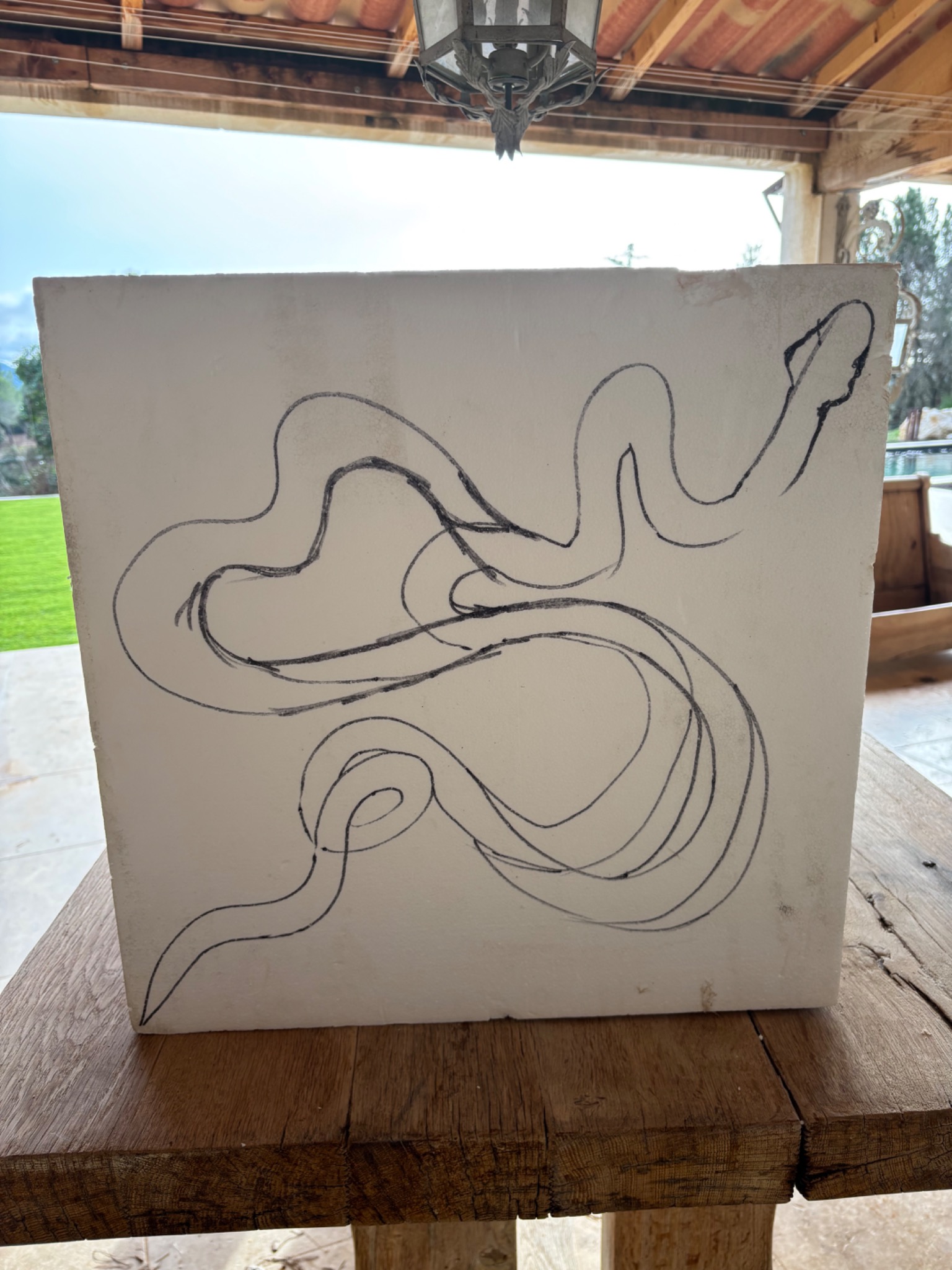 Pour réaliser mes sculptures, je pars de plusieurs plaques de polystyrène extrudé (celui qui nous sert d'isolant, meilleur car plus compact que le polystyrène expansé), que je colle entre-elles. J'ai alors un gros bloc de polystyrène, je peux ensuite dessiner la forme de ma sculpture sur les faces et passer à la découpe, puis à la mise en forme plus précise.